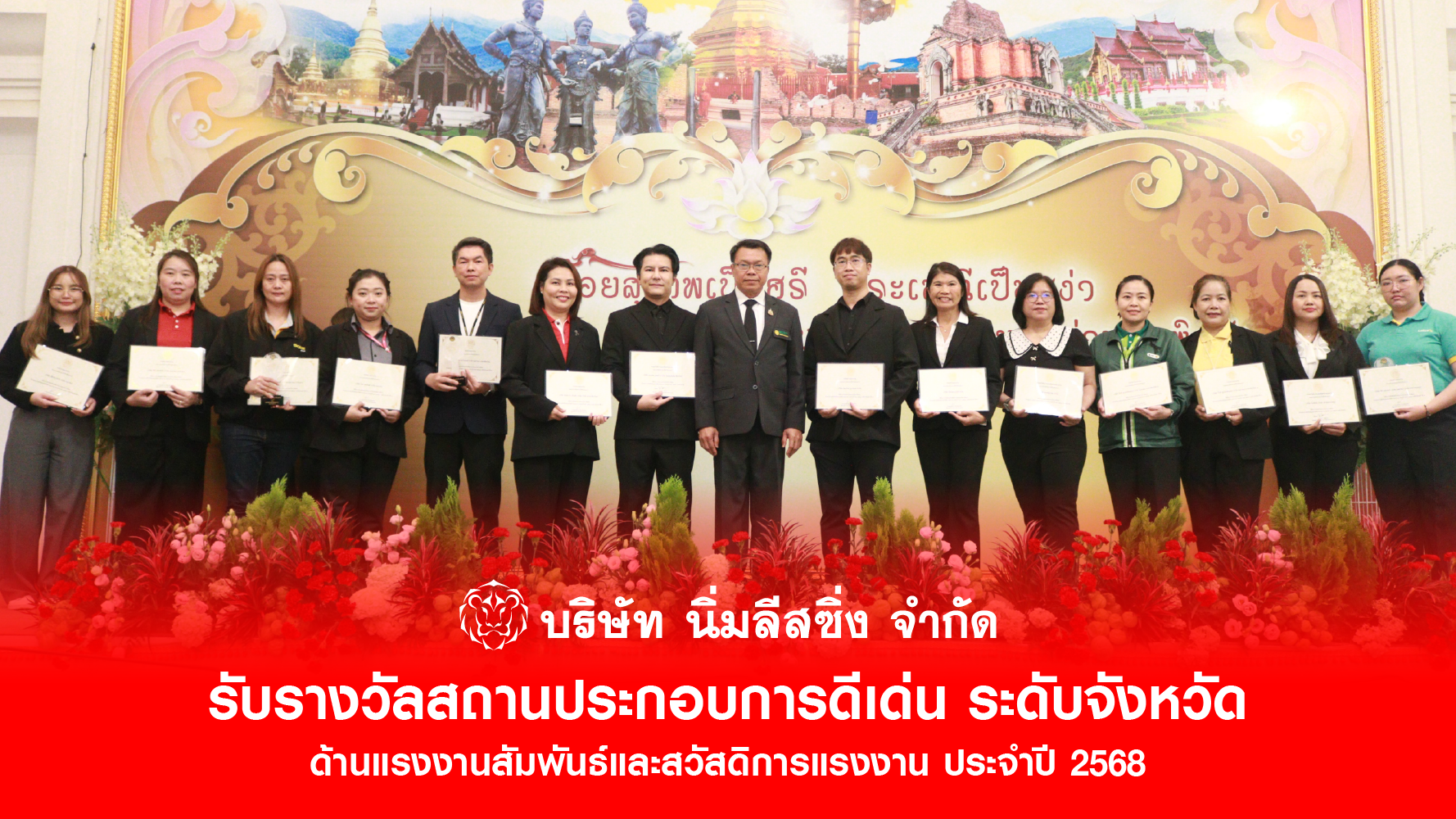 บริษัท นิ่มลีสซิ่ง จำกัด ได้รับรางวัลสถานประกอบกิจการดีเด่น ด้านแรงงานสัมพันธ์และสวัสดิการแรงงาน ประจำปี 2568 ระดับจังหวัด ...16 ธ.ค. 2568 14:26 น. -
