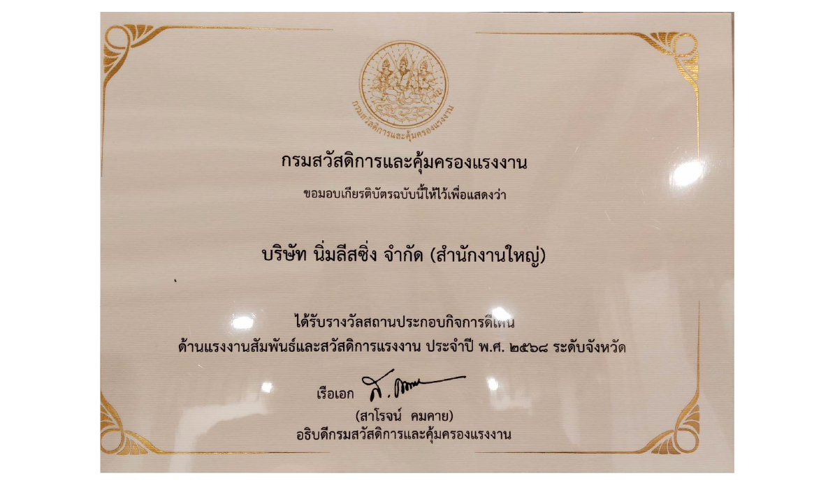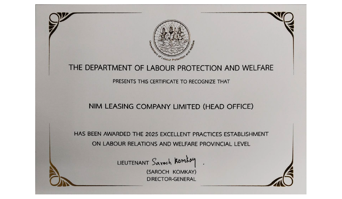 บริษัท นิ่มลีสซิ่ง จำกัด ได้รับรางวัลสถานประกอบกิจการดีเด่น ด้านแรงงานสัมพันธ์และสวัสดิการแรงงาน ประจำปี 2568 ระดับจังหวัด